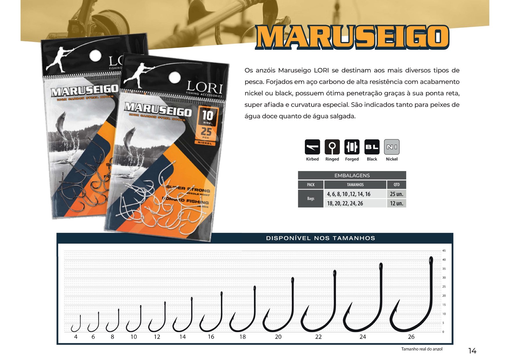 Os anzóis Maruseigo LORI se destinam aos mais diversos tipos de pesca. Forjados em aço carbono de alta resistência com acabamento nickel ou black, possuem ótima penetração graças à sua ponta reta, super afiada e curvatura especial. São indicados tanto para peixes de água doce quanto de água salgada.