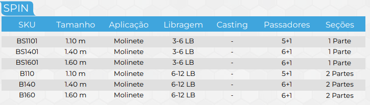Com versões Inteiriça, 1 Parte e 2 Partes, a BANDIT SPIN tem estrutura Blank maciço, fabricado em Fiberglass (polímero reforçado com fibra de vidro) garantindo resistência a tração, flexão e impacto às suas pescarias.